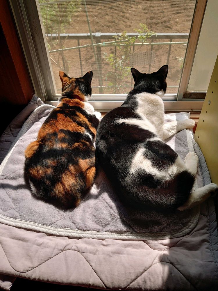 お散歩から帰ってきて、窓辺で仲良く日向ぼっこしているニャンズ。
