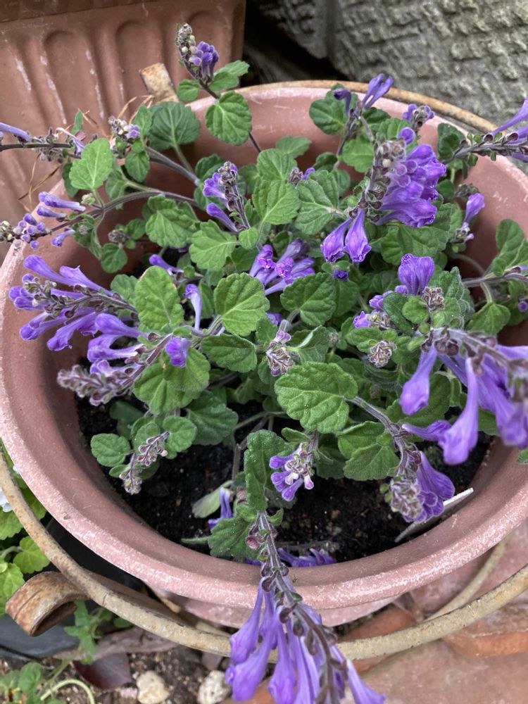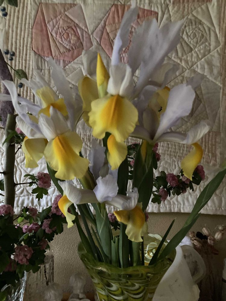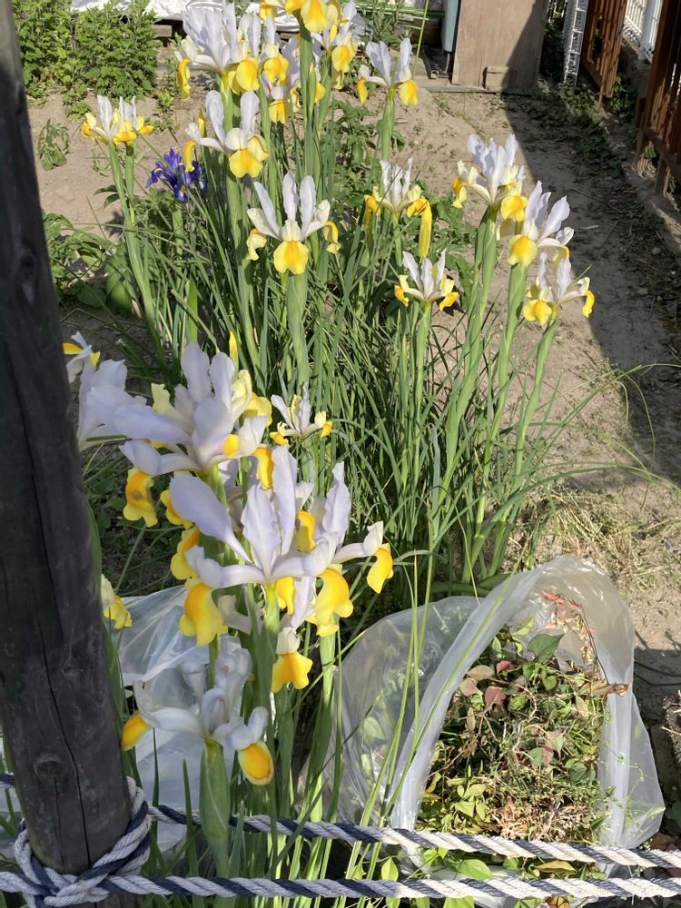 今朝の庭のタツナミソウと頂きものセイヨウサンザシと畑地で咲いていたダッチアイリスの切り花です♪