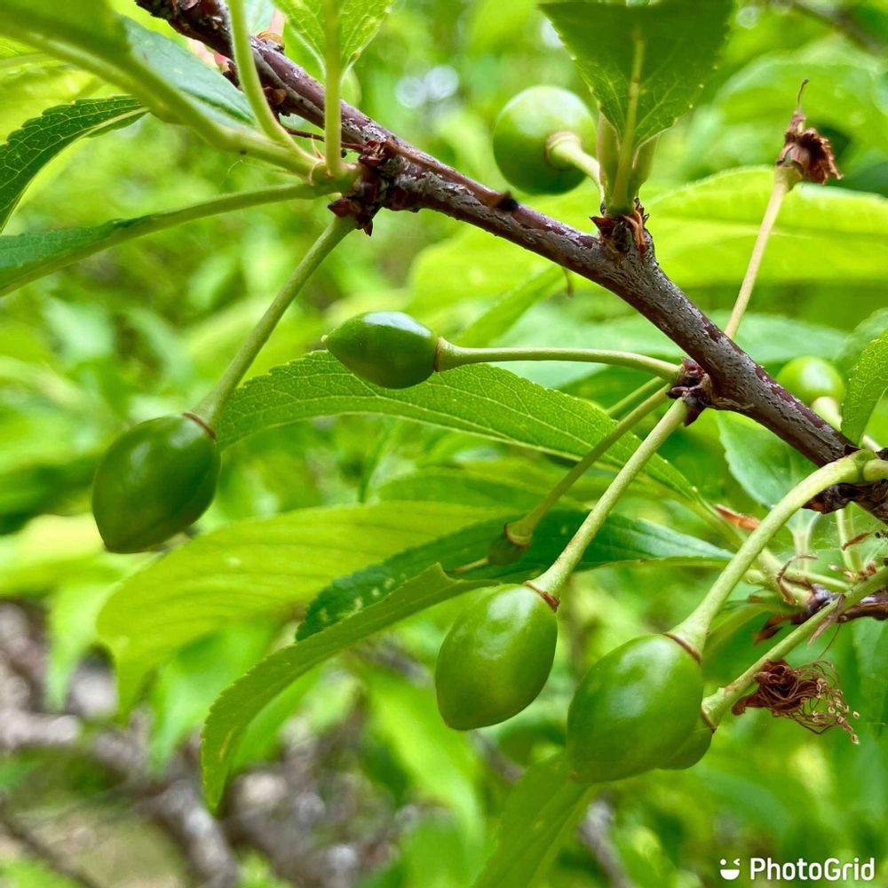 週明け月曜☁️、果樹園の早生スモモの花期が終わり幼果を着け始めてる😊。