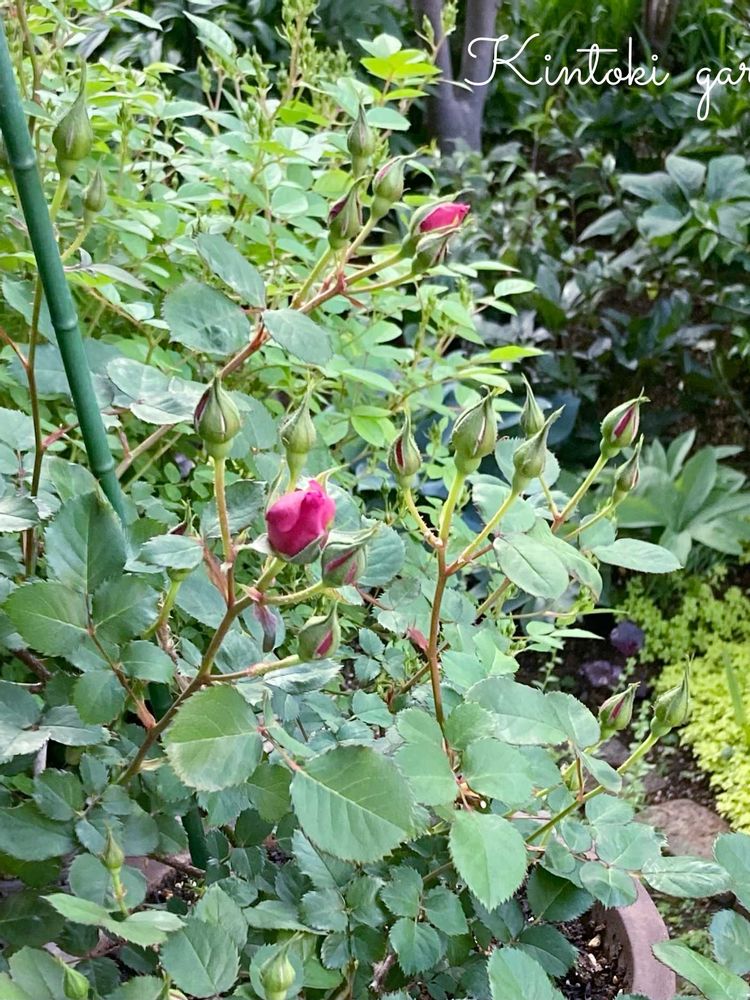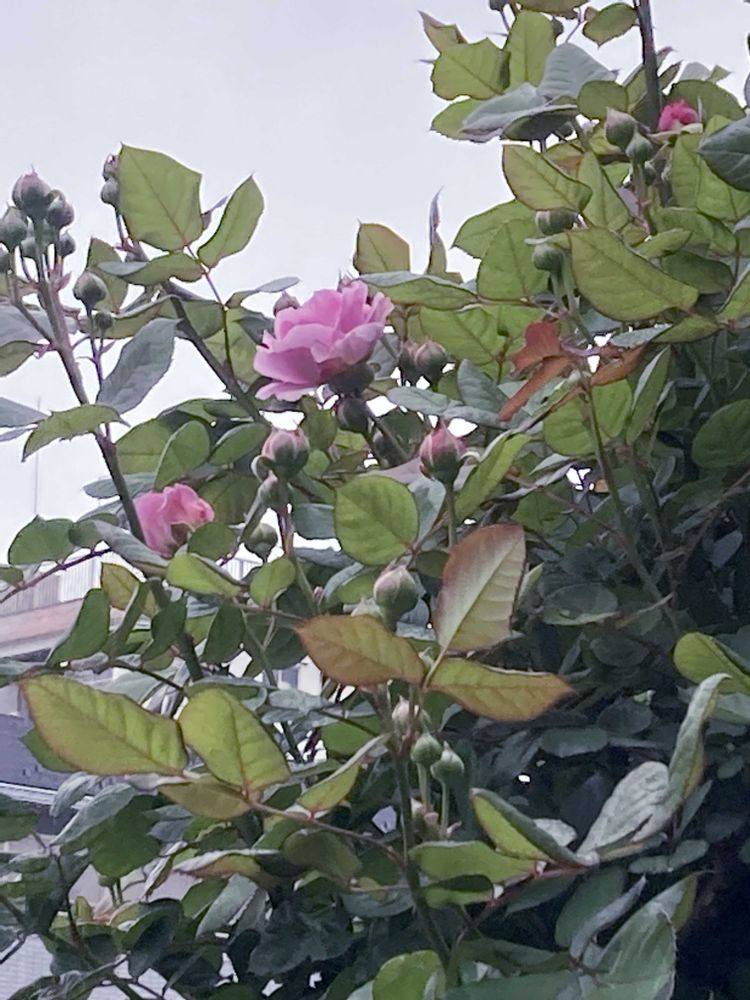 鉢バラのあおいも色付き🩷奥のミニバラ スイートチャリオットはまだ小さな硬い蕾なんです。