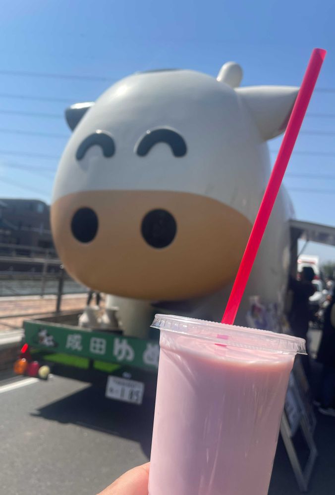 所要で(((((*´・ω・)トコトコしてたら市民祭に出くわした。成田ゆめ牧場の牛さんトラック ミッケ😊いちご牛乳🍓🥛ごくごく美味し。😊💕