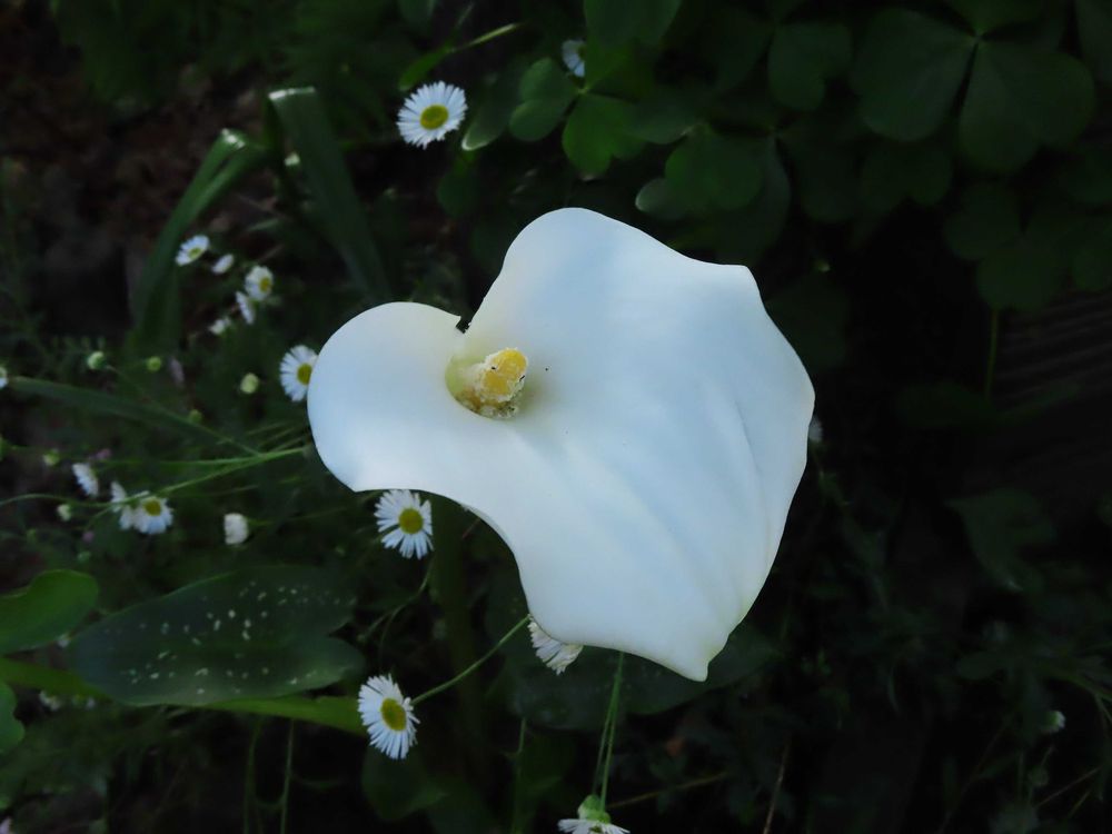 木陰に咲いている「カラー」、薄暗いのでお花の白が目立ちます。パチリ