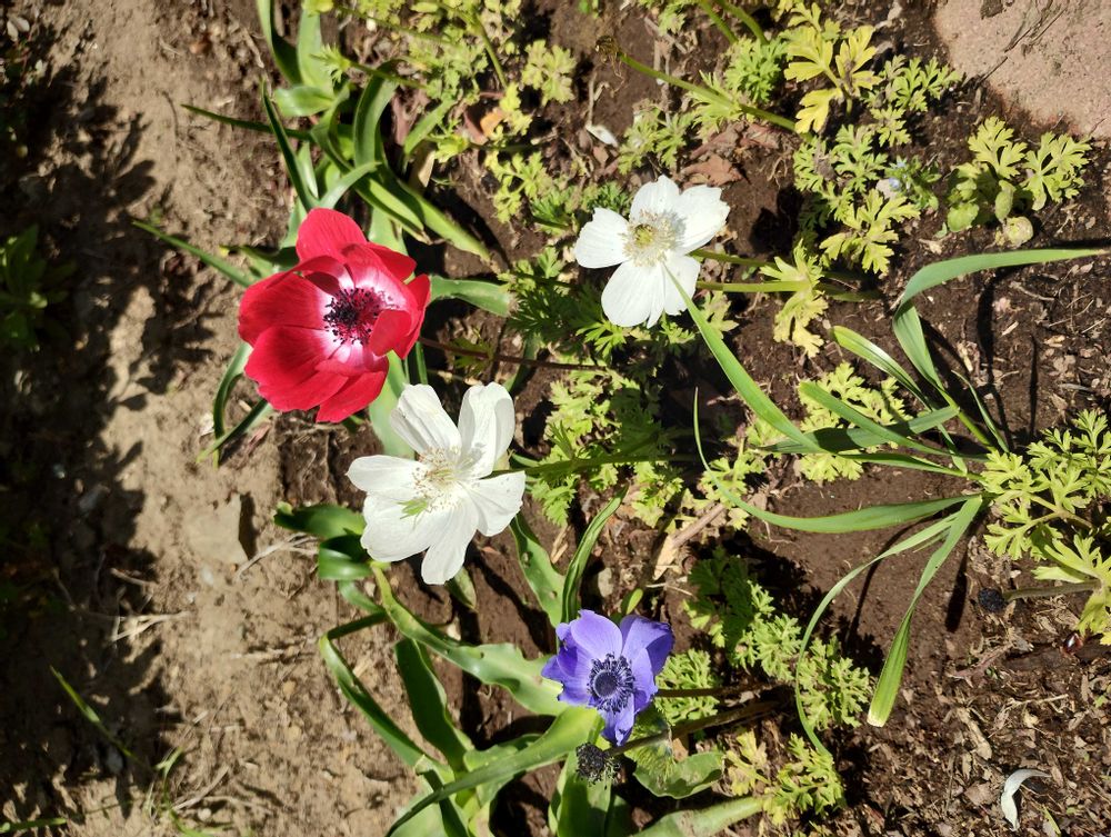 暖かな日差しに気持ちよさそう。三色の「アネモネ・ポルト」 パチリ