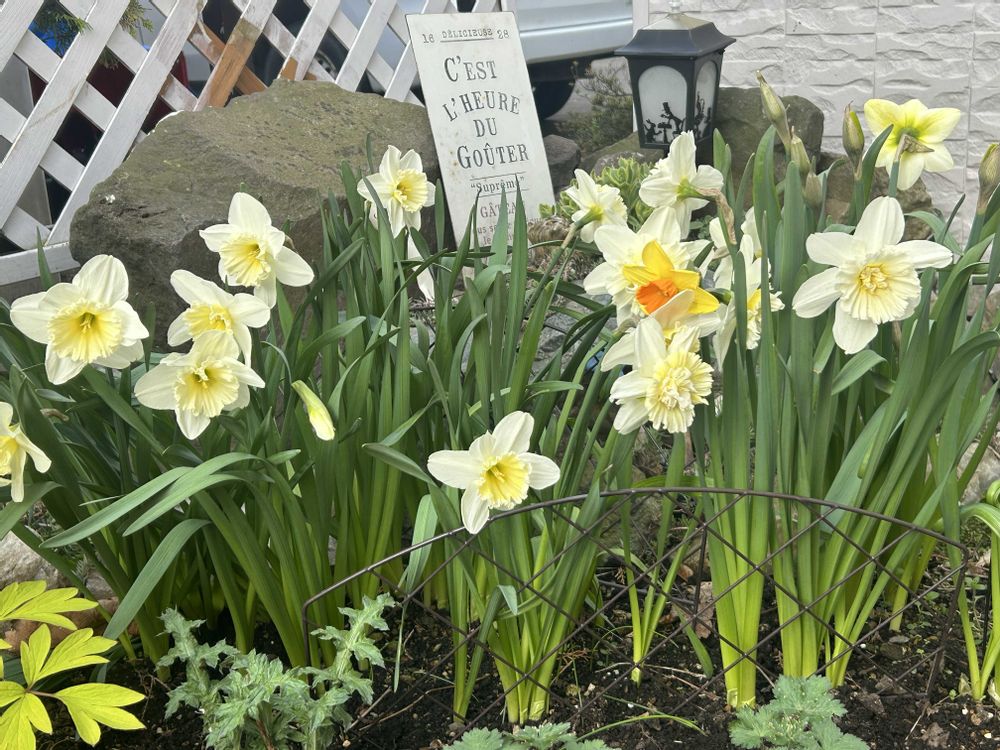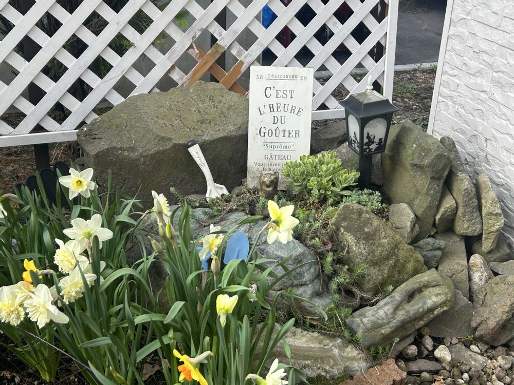 今はクリスマスローズと水仙です。水仙も去年より数が増えてくれたようです。ウサギさんも出しました🐰週末にフェンスにもたれてしまったロックガーデン風コーナーの大きな石を3人がかりで動かしました😅