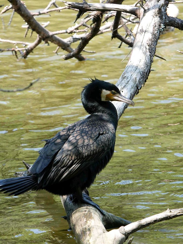 ⑤ 冬鳥のカモたちが去ってすっかり寂しくなった池畔の湖面を見つめるカワウ(♀)