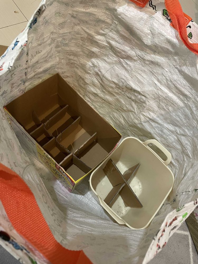 できるだけお金をかけたくなかったので、仕切りも100均で購入した方が使いやすいと思ったけど、とりあえずは段ボール細長くきって、差し込むところも細長く何ヶ所かチョキチョキで作成😂