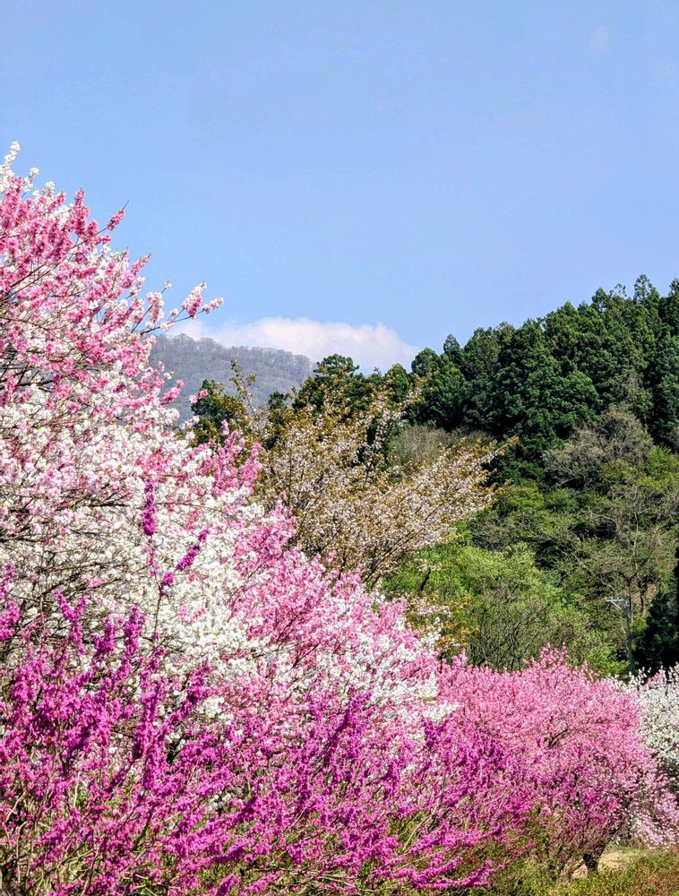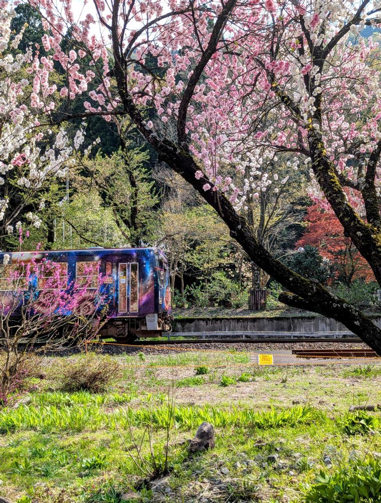 山に囲まれた静かな駅舎とハナモモは今や県内でも有名になりました🌸