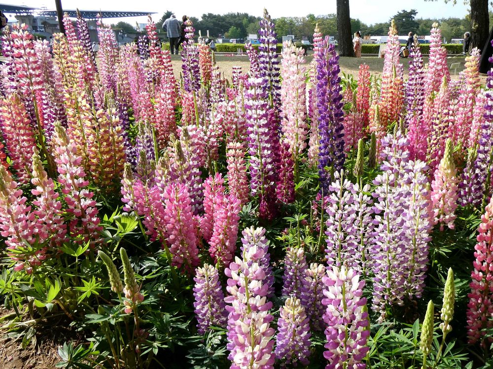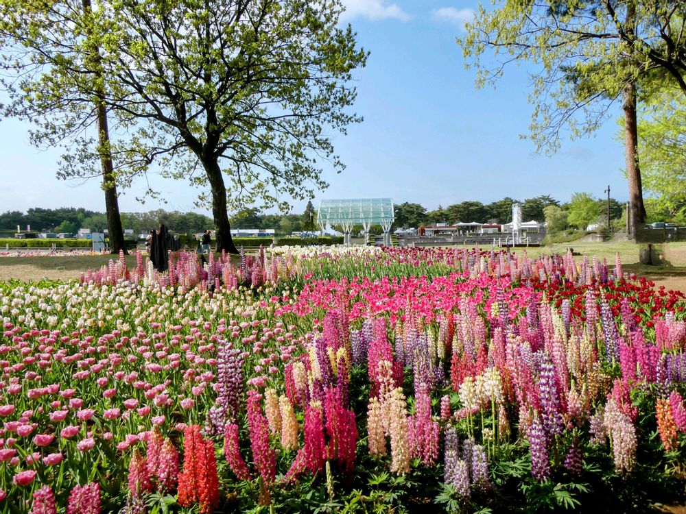 色とりどりのルピナス💛🤍🩷💜とチューリップ🌷の花壇が青空に映えて綺麗でした😊✨
