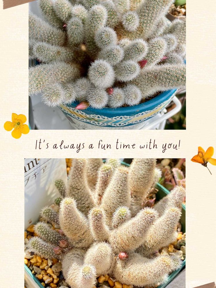 こんにちはー。サボテンさん。可愛い。ピンクのお花それにファファ。🎶🎶