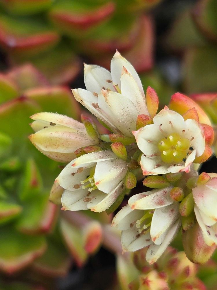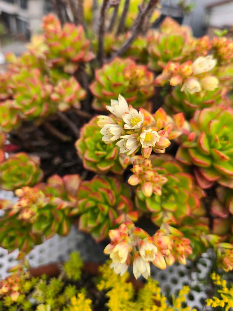 365日 屋上の空の下にある多肉植物寄せ植えの鉢 3鉢に沢山咲いてきているレディジアの花