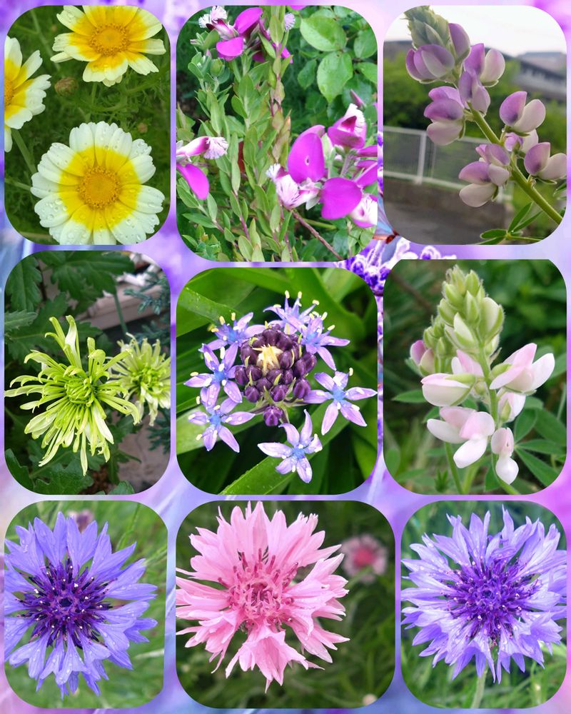 左上から時計回りに、春菊の花、ポリガラ、矮性ルピナス薄紫、ビンク、矢車菊3色、カガリ弁咲ロレト、シラー・ペルビアナです✌️