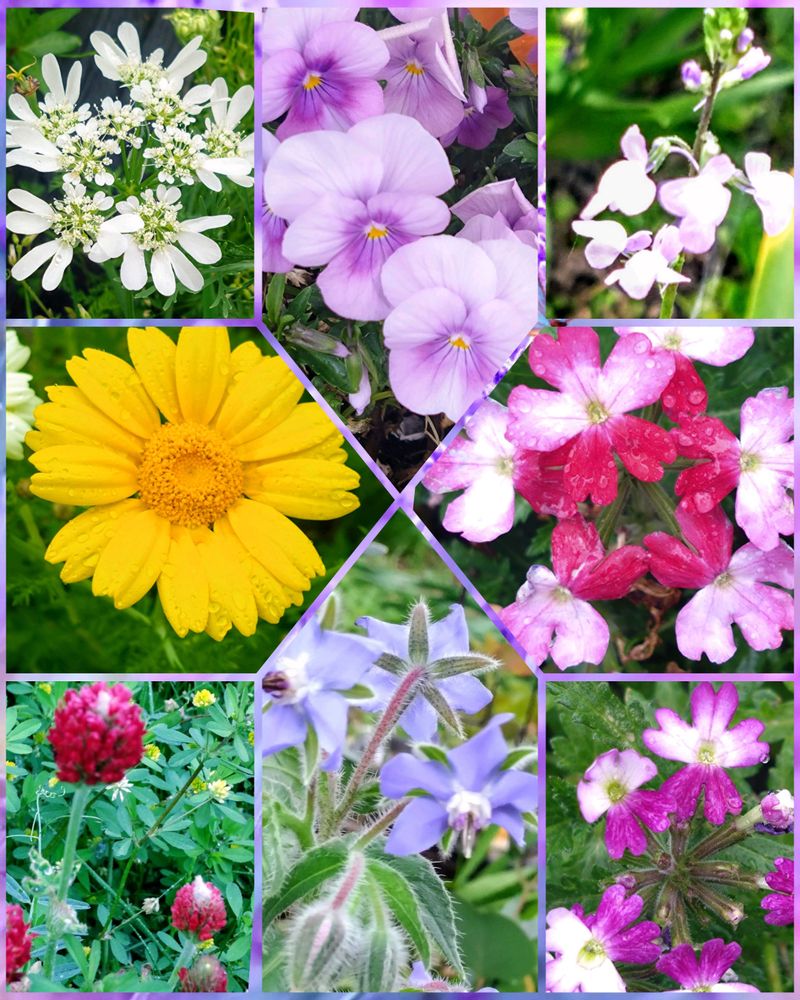 左上から時計回りにオルレア、ビオラ、マツバウンラン、バーベナ2色、ボリジ、ストロベリーキャンドル、春菊のお花です🤍❤️🩷💛💜