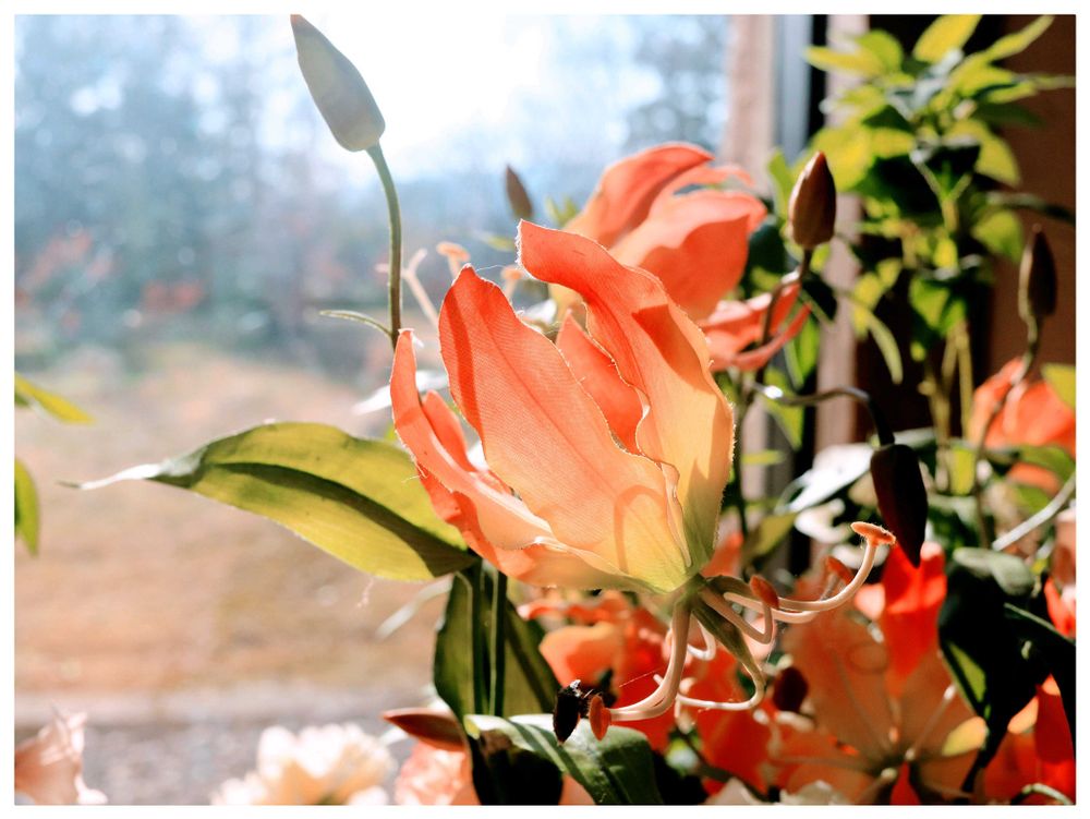 硝子窓越しに朝日を気持ち良さそうに浴びるグロリオサです( ˶'ᵕ'˶)و