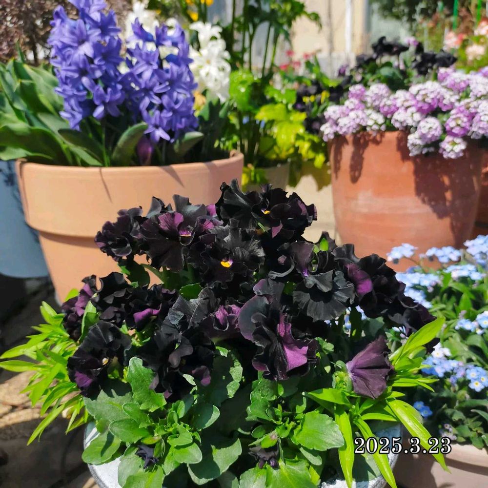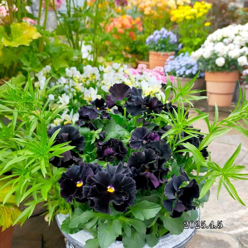 真ん中に植えているパンジーは、気温が上がって花色が変化したサトウ園芸 さんの『シュヴァリエドゥリュンヌ 』
