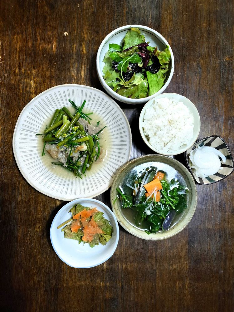 美味しそうな夕食ですね。ぶどうの葉の胡麻和え、なんでも食べられるのですね。