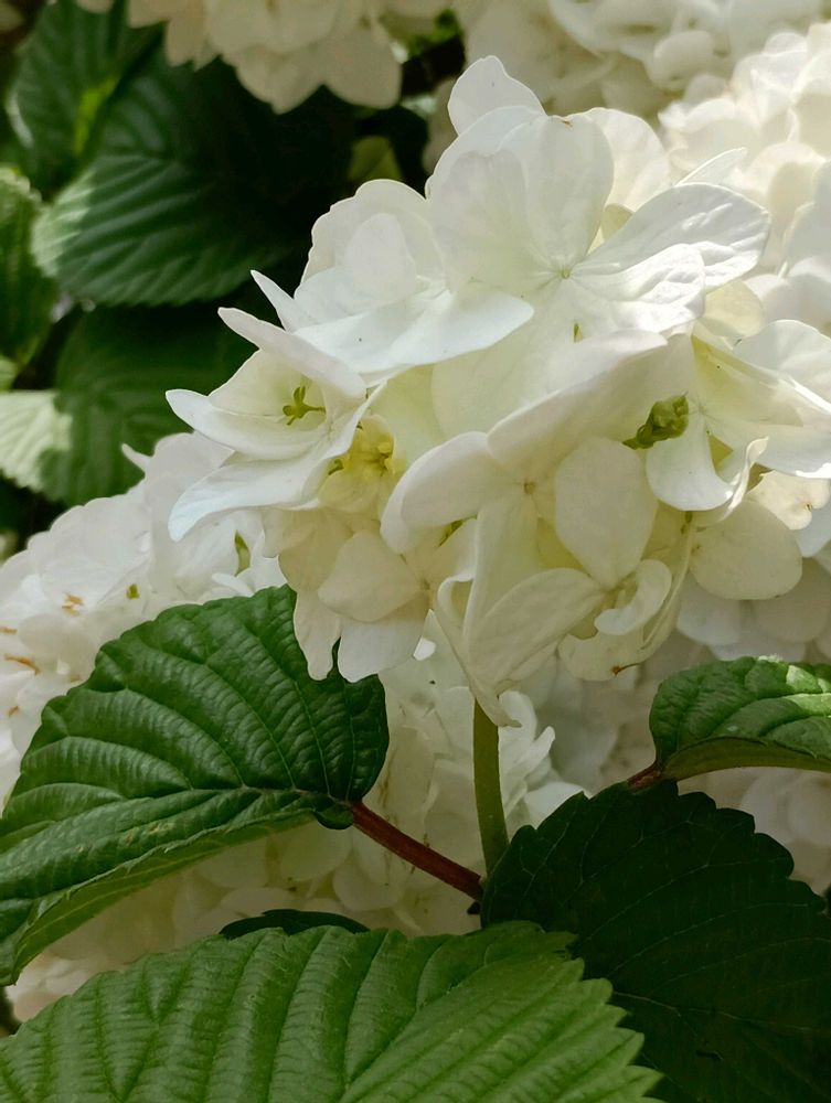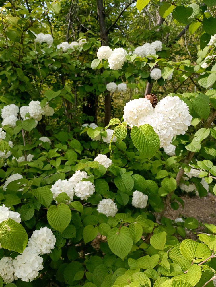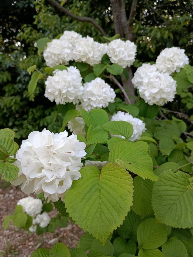 すべて装飾花で、大小様々な大きさの花の、真っ白な「手毬」が、沢山ついていて、