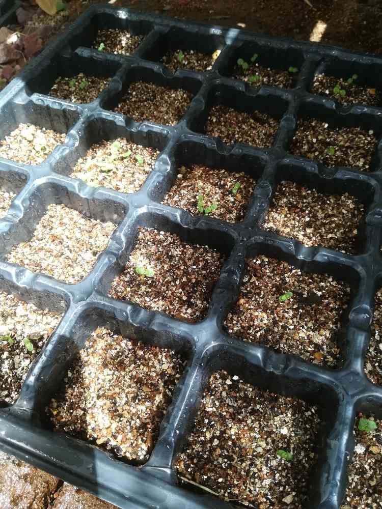 先週最低気温が20度以下に下がってたタイミングで、冬花壇向けに植え付けるビオラの種まきをしました。無事ぼちぼち発芽してきました。