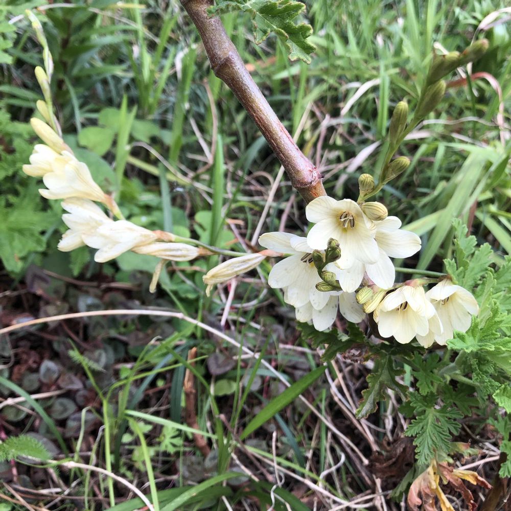 花穂が5本できて過去最高の花つきの白花トリトニアだが、雨に打たれて全部倒れた。近くの植物の介助(寄りかかる)で立たせて撮影。残念なやつめ。