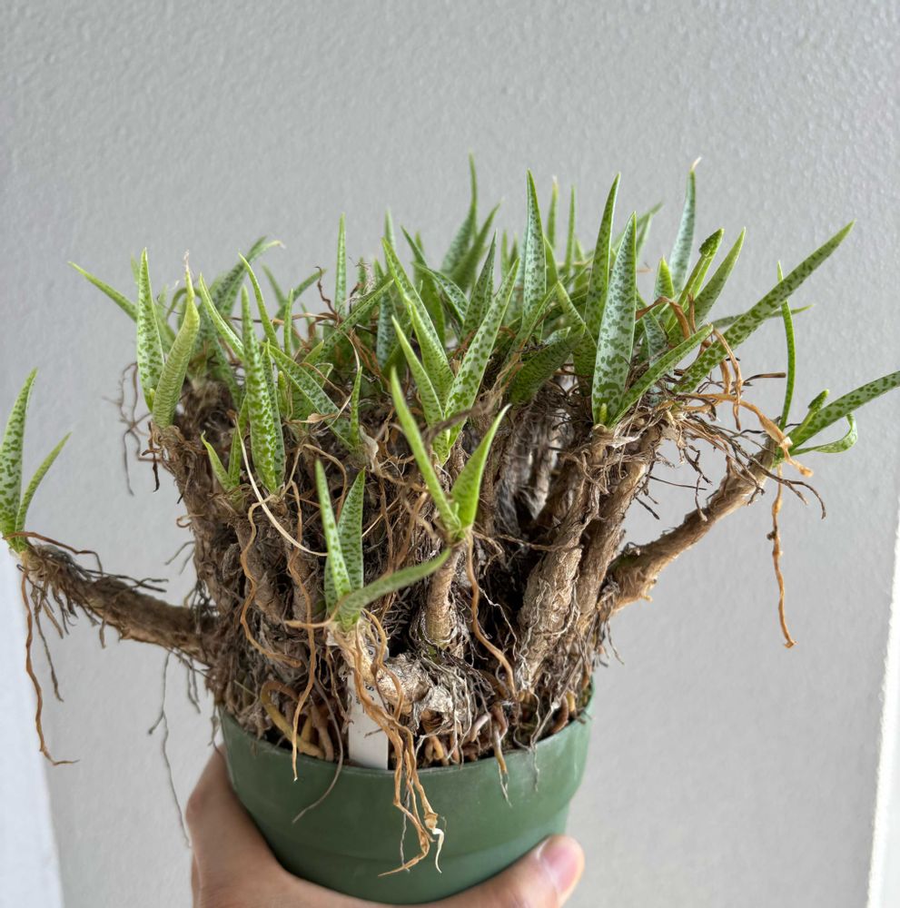 20年くらい前に入手したソシアリス的なもの。久しぶりに掃除しようとさげ出したらタケノコ状態に😅こいつは全く球根が丸くならない変わり者。葉っぱメロン色で葉裏も模様があります。植え替えを嫌うので少し弱いです。