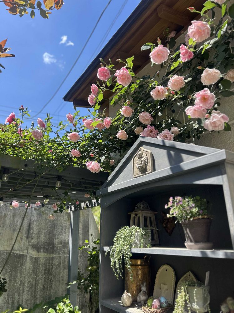 グングン伸びてパーゴラの横の壁面にも誘引してみたんです🩷