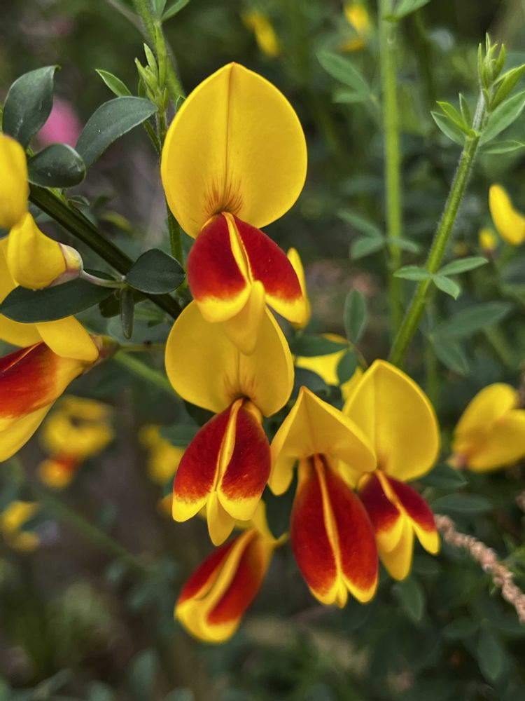 エニシダのお花、黄色に赤が入った可愛らしいエニシダ、ホホバエニシダっていうのですね。検索して見ました。園芸種ですって😀