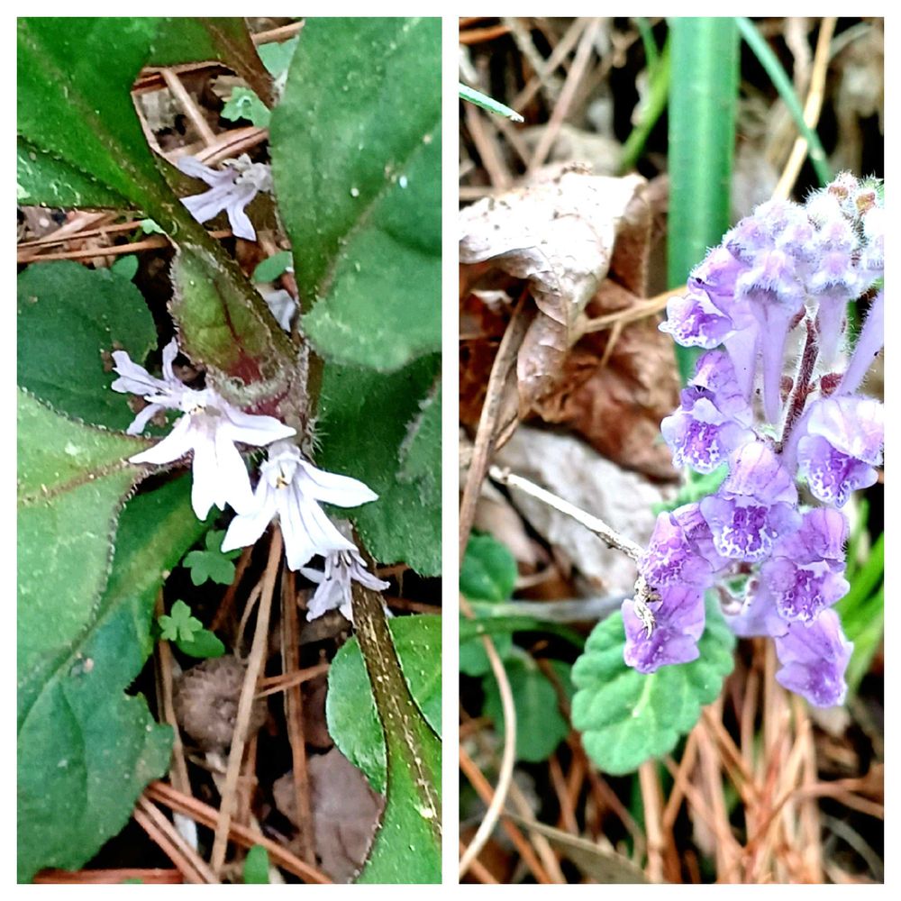 ③林の中の遊歩道脇で目立たず2株咲いていたツクバキンモンソウと、斜面に咲き始めていたタツナミソウ😲です