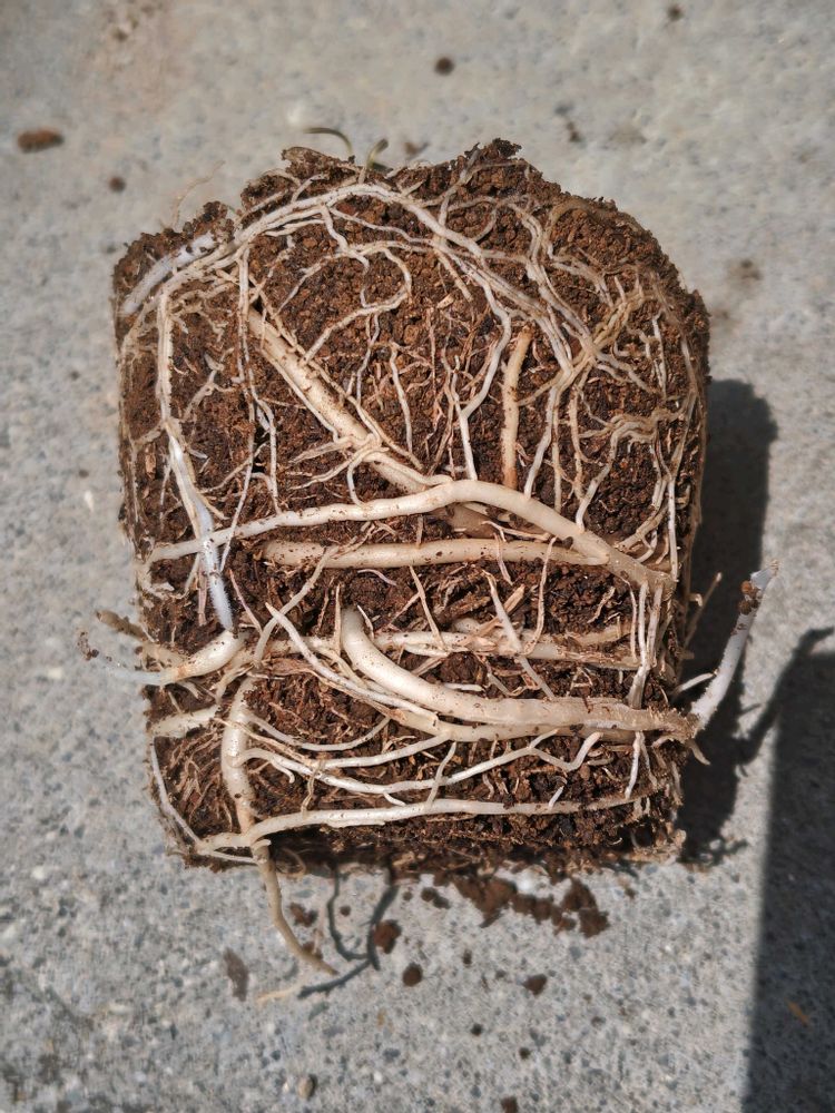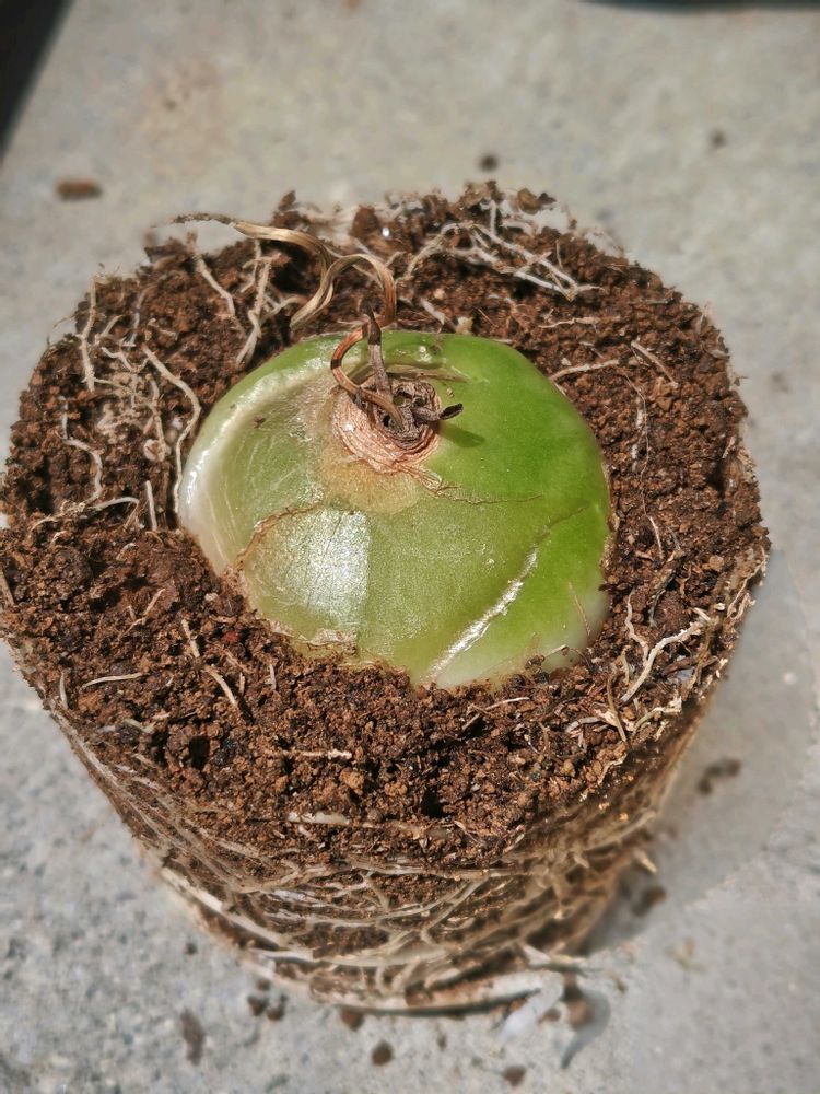 鉢から抜いてみると🧅がぐんと大きくなっていてみっちり根が張っていたので少し大きな鉢に植え替え