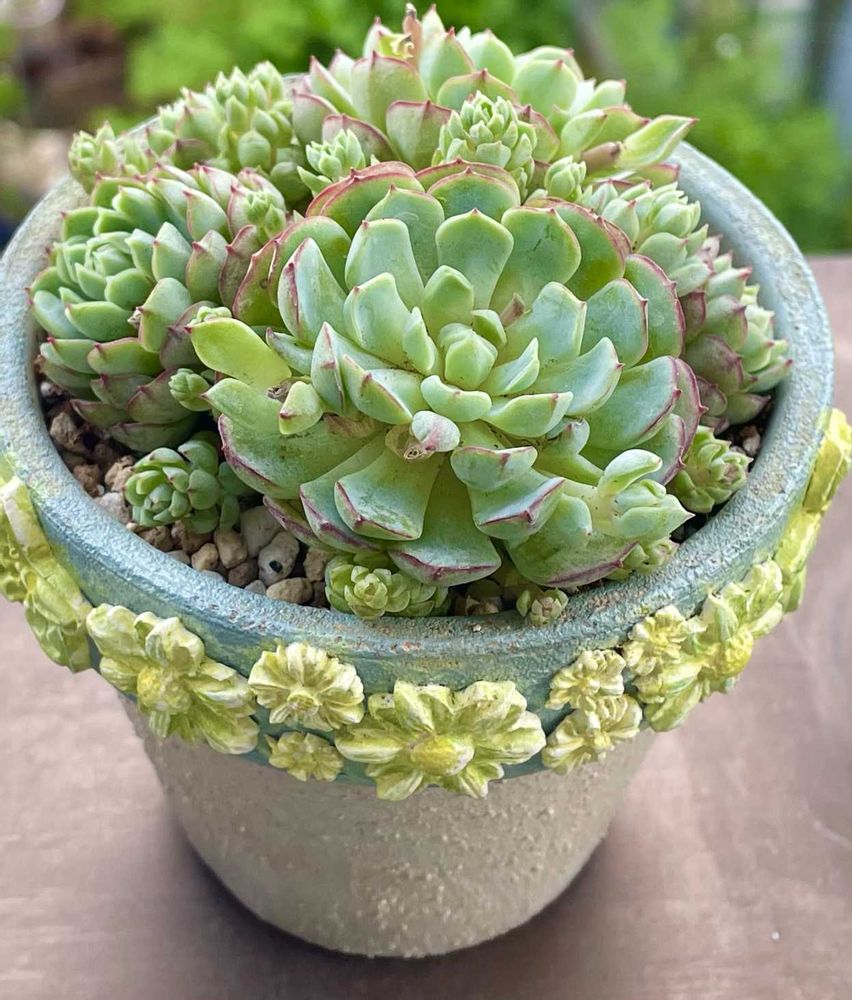 リメ鉢も新しい試み😃シリコンモールドで型とった粘土のお花🌼をボンドで付けてみました😘なかなかお気に入り💓