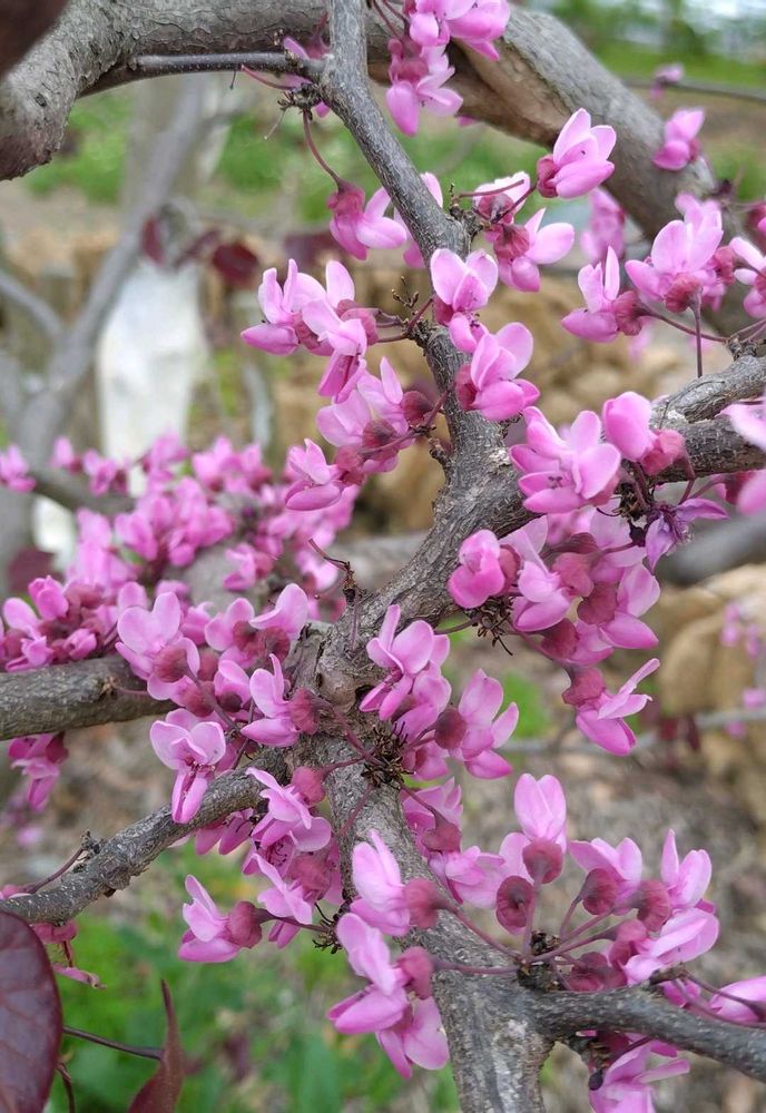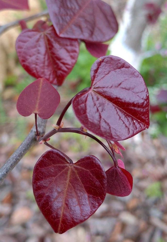 マメ科ハナズオウ属の落葉小高木。北米原産。湿潤な森林に生える。大木になる。樹高10m以上。葉は円形。基部はハート形で鋸歯はない。表面は青銅色から鮮緑色に変わり、無毛。葉裏は毛があることが多い。秋に黄葉することがある。花期は春〜初夏。蝶形花を若葉の展開より前か同時期に咲かせる。花は淡紅色でハナズオウより小さい。前年枝に沿って束生し、しばしば主枝や幹にもつく。果実は豆果。緑色から桃色になり、褐色に熟す。豪華な赤紫色の葉群のために選抜された品種『フォレストパンジー』などのがある。