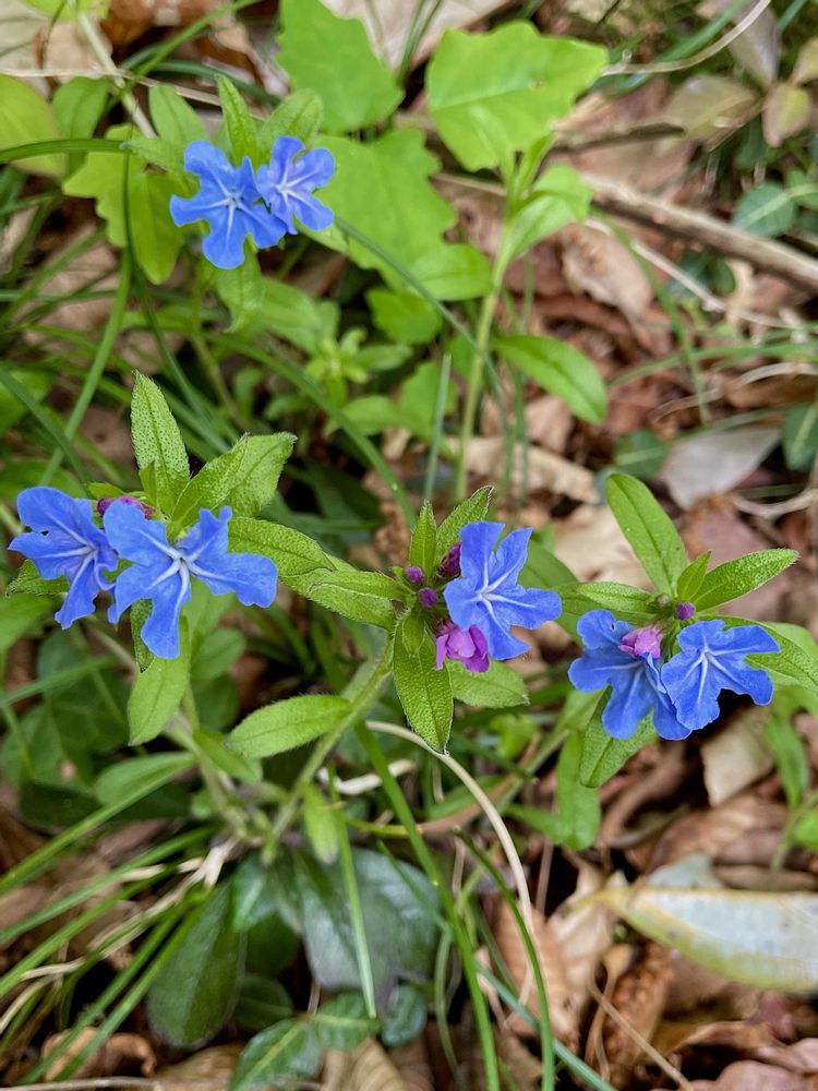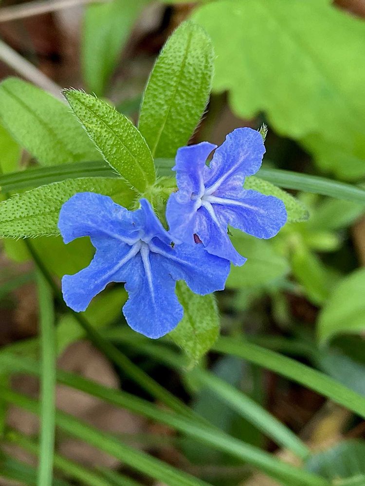 地を這いつくばって伸びて行き、咲いています。草達の中に埋もれているので、目立つように青い色になったような…
