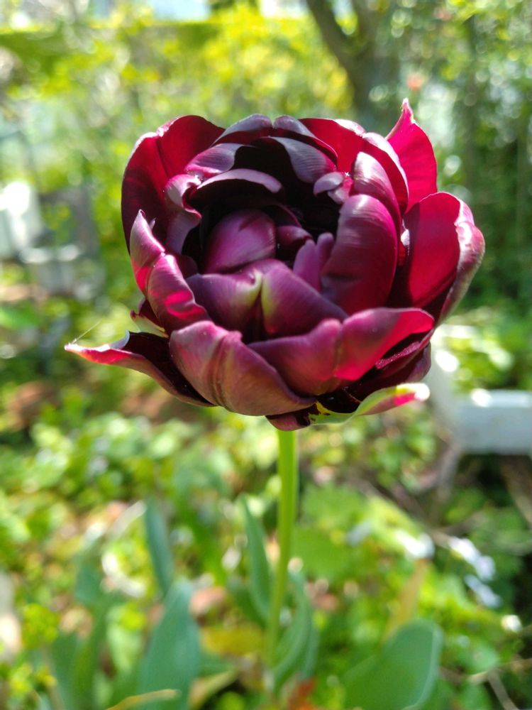 一昨年植えた八重咲きチューリップの【ブラックヒーロー】と思われます。