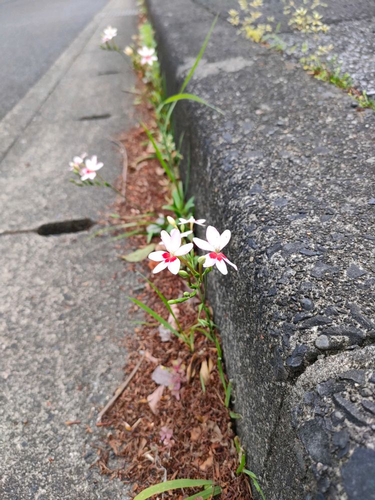 路側溝のフタと歩道縁石の隙間に咲いたヒメヒオウギです。