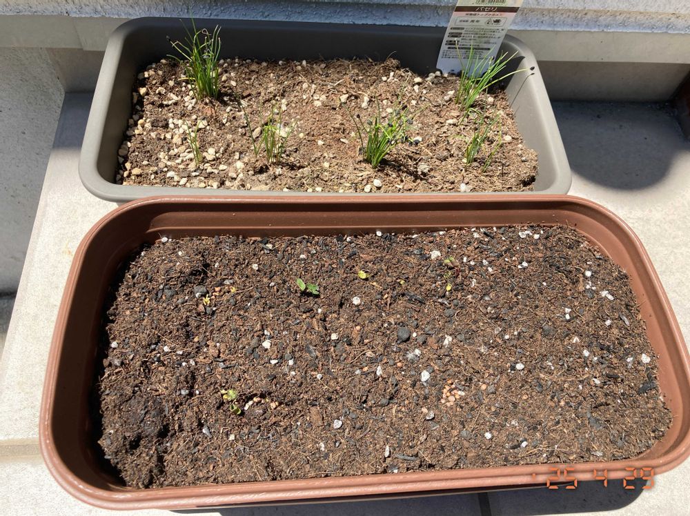 ニラはこのサイズから中々成長しない( ´・ω・`)肥料とかいるのかなー?試してみるか