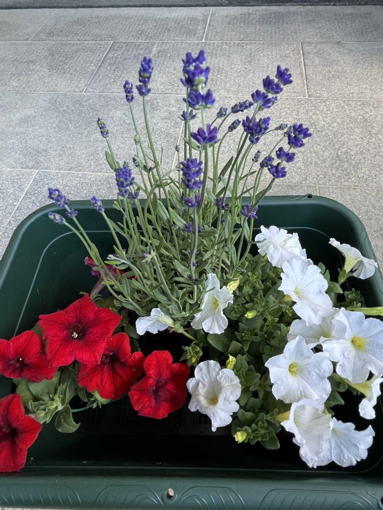 フラワーショップで頂いたラベンダー🪻と98円のペチュニア紅白で寄せ植えします✌️