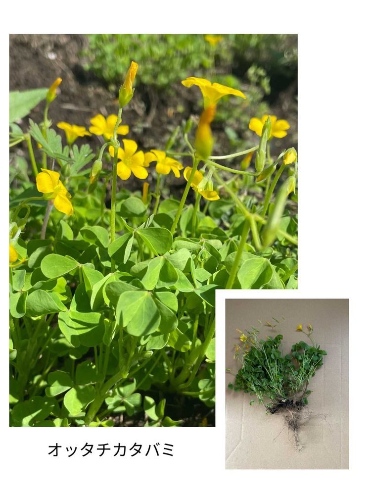 「カタバミは太い直根を持ち茎が地表を這って広がるのに対し、オッタチカタバミは直根を持たず、地中の地下茎が水平に伸びて、そこから地上茎が立ち上がる」