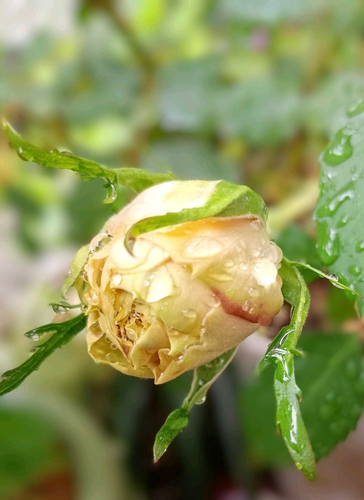 ④なかなか咲かないバラの蕾 🩷ピンクぽかったはずだけど〜クリーム色のよう?