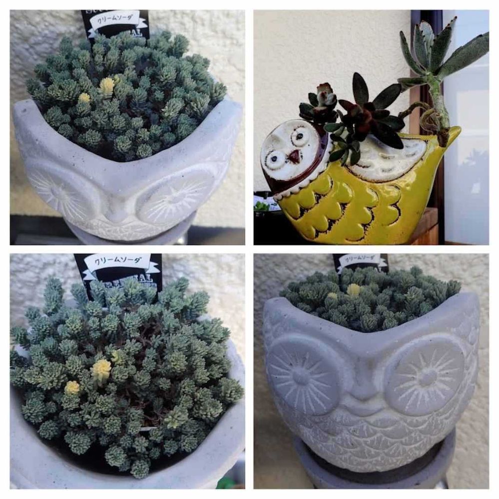 フクロウの鉢のセダム・クリームソーダさんと、フクロウの蚊遣りに植えたままの月兎耳仲間さんたち、ちゃんと植え替えてあげないと~ヾ(≧∇≦)ノ