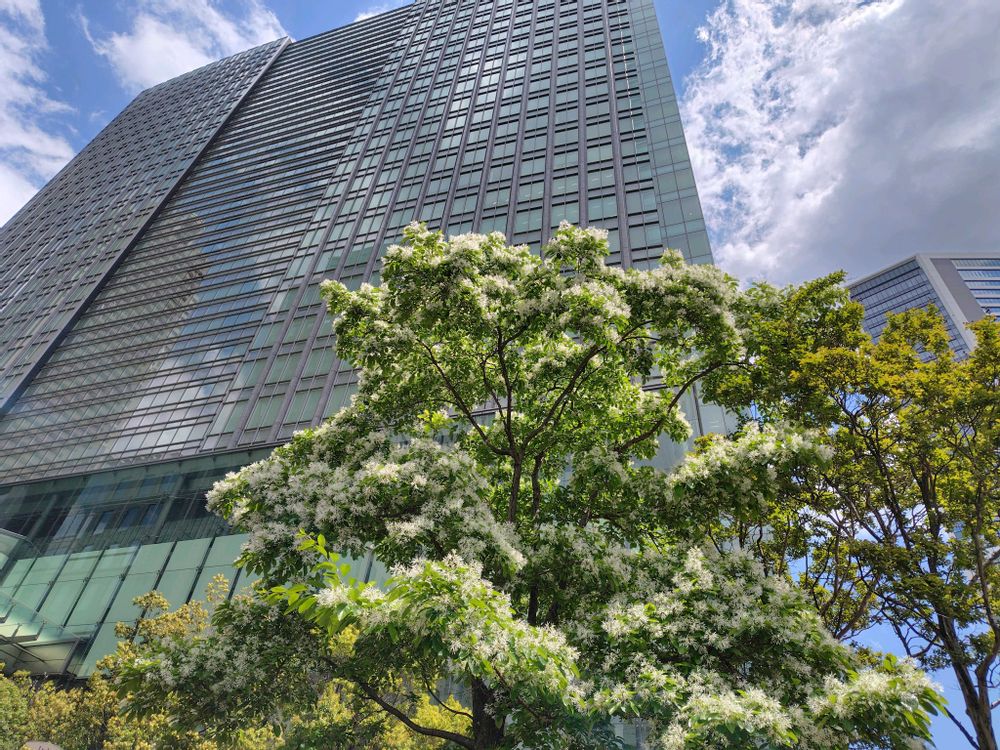 ①青空と高層ビルに映えるヒトツバタゴ