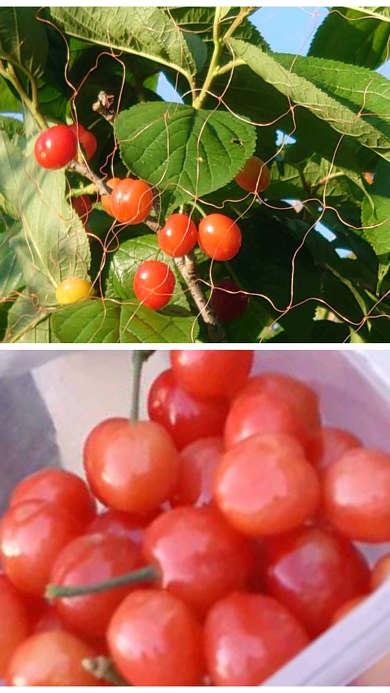 今日は先日ネットがけした🍒が色づいたので、真っ赤なのを採って食べてみました〜甘かったデス😋