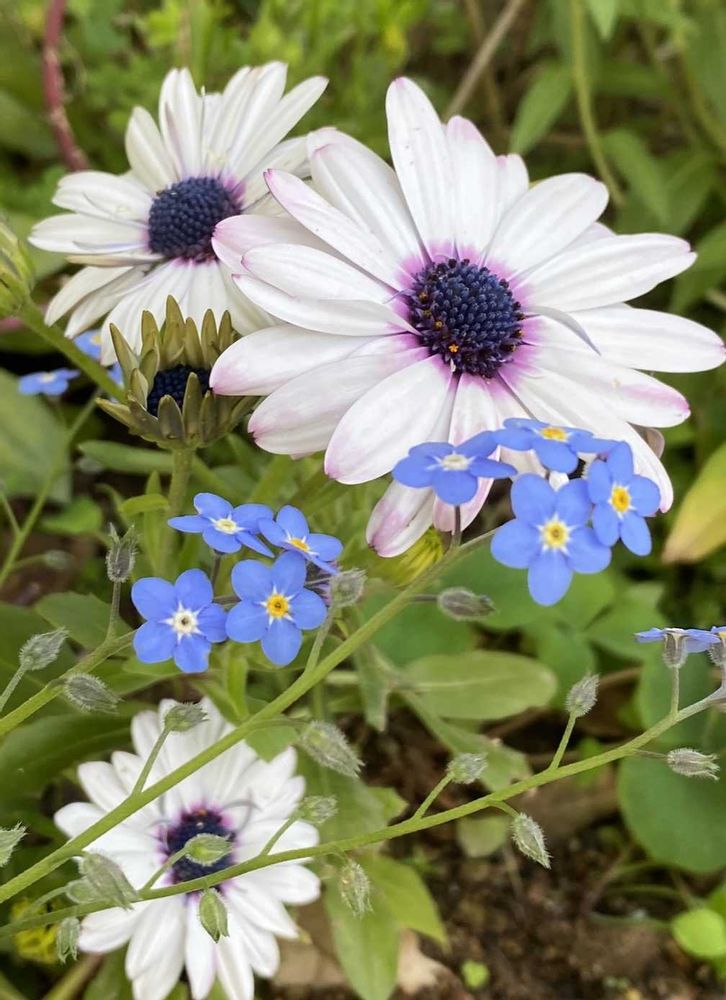 園芸店からの苗はこんもりと、友だちがくれた苗はスマートに、オステオさんと仲良く咲いています😄