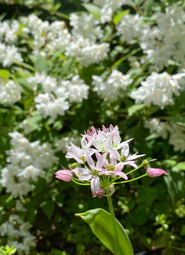 4枚目は、植えた覚えがない、アリウムさん? 満開のヒメウツギをバックに、輝いていました💕✨🍀😊