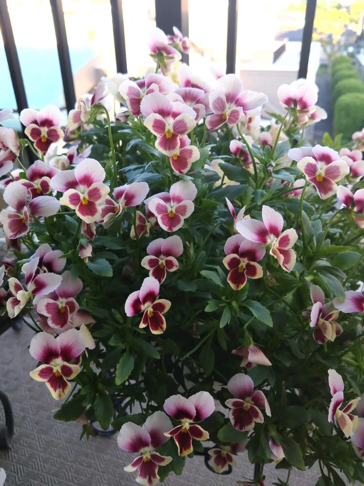 外を歩くと花壇にプランターに、パンジー・ビオラがキレイに咲いています。うちのベランダも…‼️と思って花殻摘み、剪定を頑張ってます