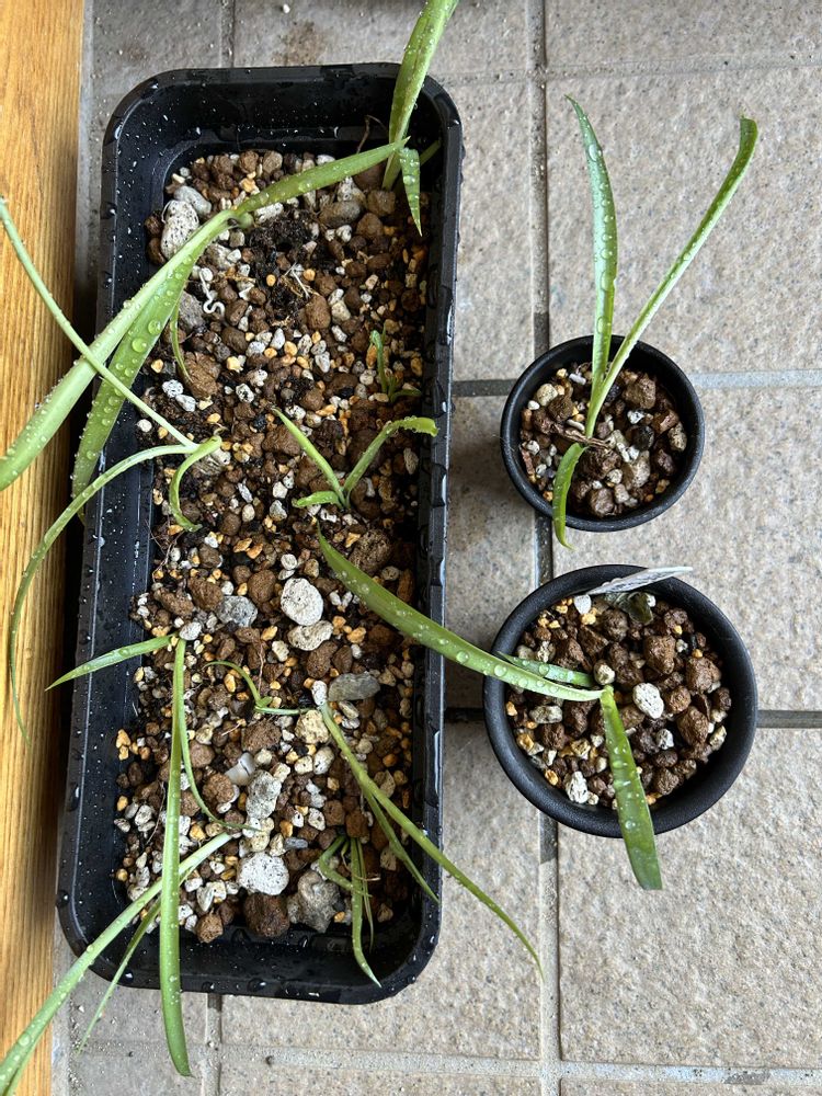 自家産マンフレダの子達を播種床から2鉢+プランターに植え替えました。