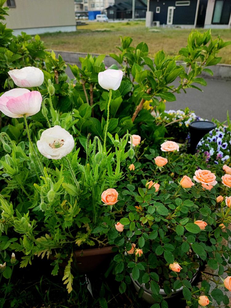 敷地入口のポピーとバラ スイートドリーム。ゆめかわいいコラボです。