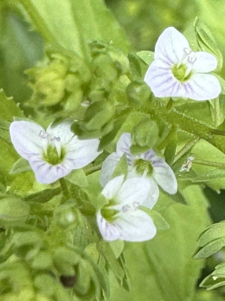 花が小さくて白色から白紫色で淡紫色の脈があり、葉の縁にやや尖る鋸歯がある