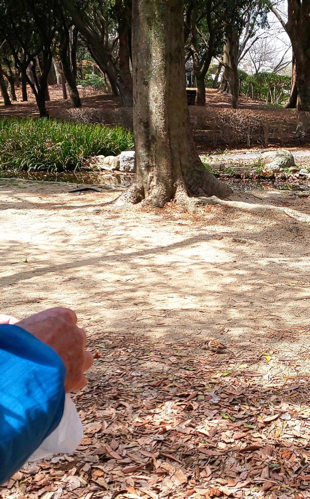 私が大木の真上の動画を撮っていた時、静かに真下にカメラを向けると、いつの間にか夫が幹に持たれてピースサインして作り笑いしてました〜 迷惑なんだけど〜