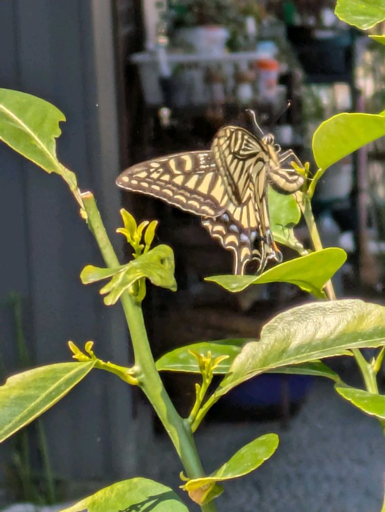 庭にもキアゲハ🦋も登場😘 シークワーサーの木やゴウダソウ?の花をみつけヒラヒラ飛んでました😂