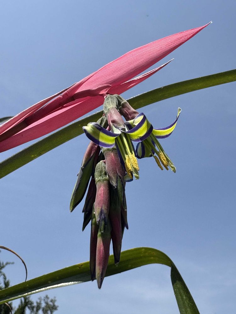 ⑤庭の隅にいたヨウラクツツアナナスも今日開花していました〜🎊🎶