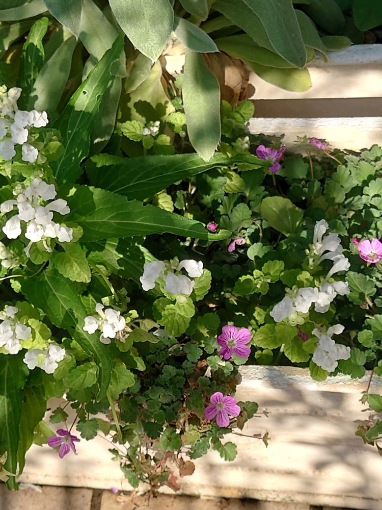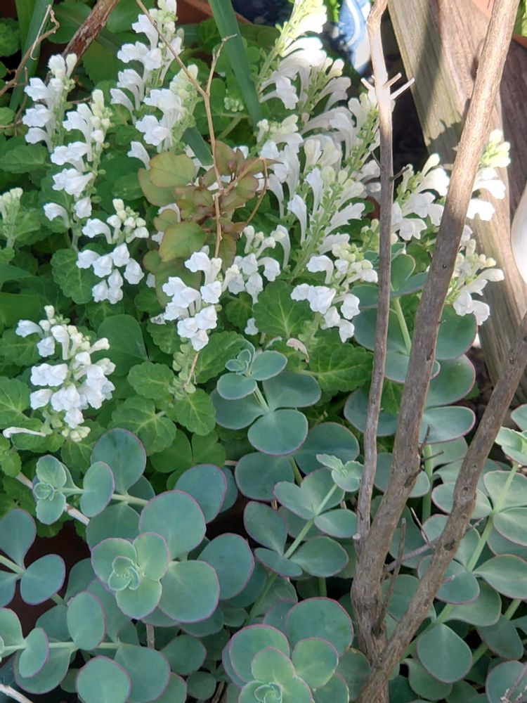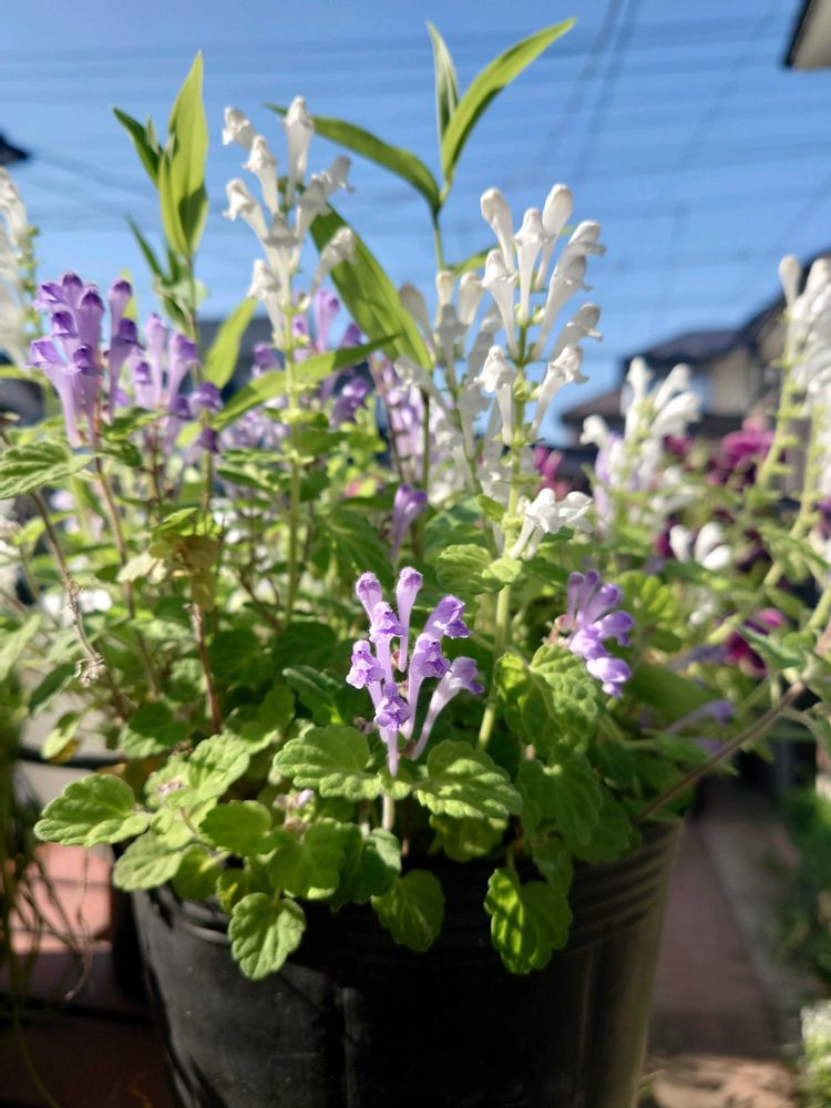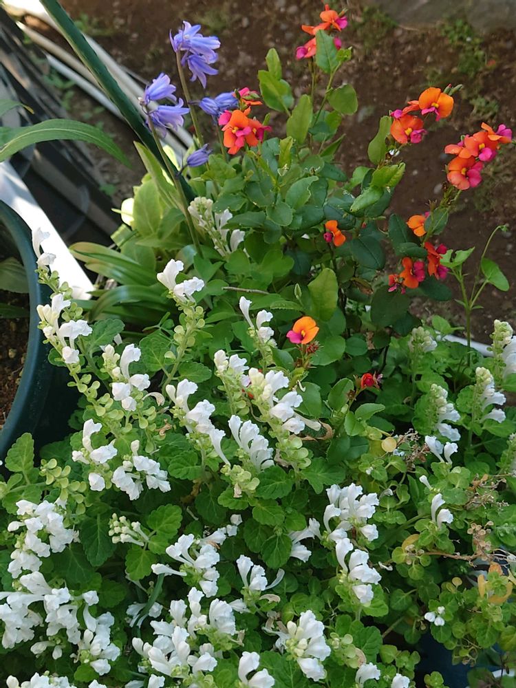 タツナミソウが小さな庭の色々な植物とおしゃべりしているみたいです🤗