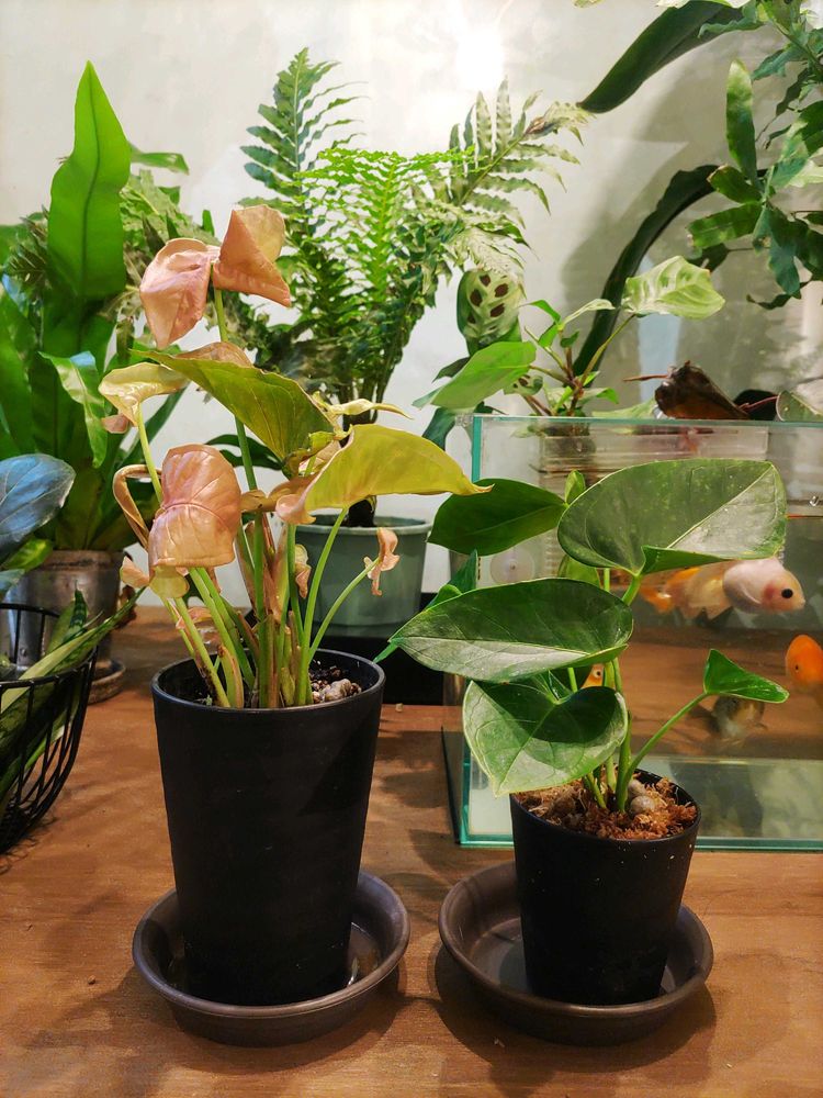 今年は、温水槽の水挿しで冬を越したアンスリウムとシンゴニウムネオン。